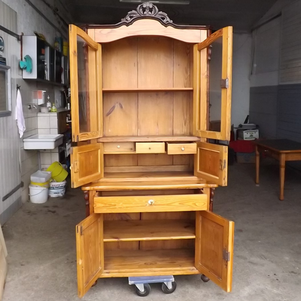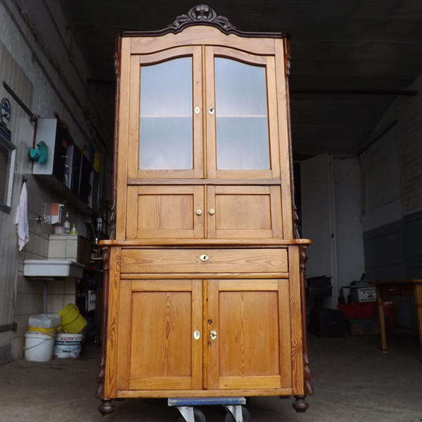 um 1900 (Kiefer massiv). Zweiteiliger Korpus: zwei Türen mit einer darüber liegender breiten Schublade im Unterschrank. Im Aufsatz zwei hohe, verglaste Türen, darunter zwei kleinere (siehe Detailbilder). Im Innenraum Fachböden und weitere Schübe. Ältere Restaurierung mit Gebrauchsspuren.
