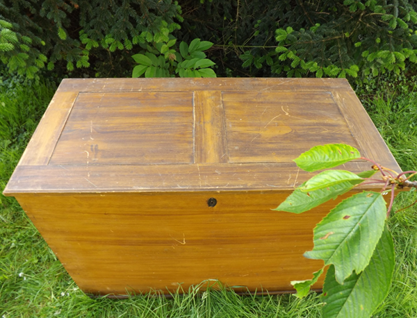 um 1920. Fichte/Tanne hell bierlasiert (Flachdeckeltruhe unrestauriert). Gezinkter Korpus auf Kufen, der nach oben zu öffnende Deckel in Rahmenbauweise (siehe Detailbilder). Alterskonform, unrestauriert erhalten, innen sauber; rechter Griff und Schlüssel abgängig.