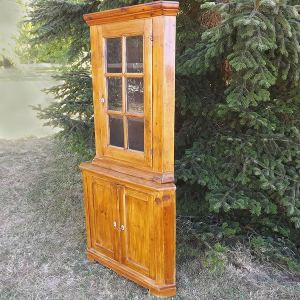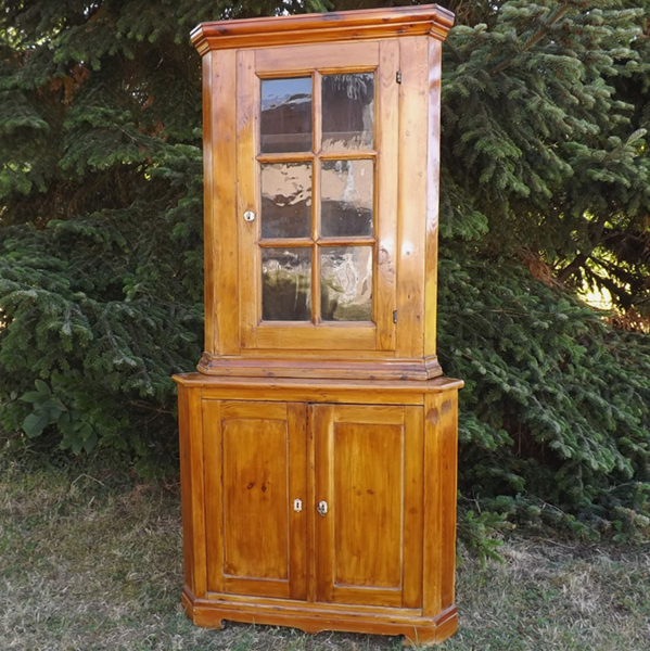 Weichholz massiv (Eckschrank ländlich). Zweiteiliger, an den Längskanten geschrägter Korpus auf geschweiftem Zargensockel; zweitüriger Unterschrank. Im Aufsatz sechsfach gefeldert verglast; profilierte Gesimsleiste. Ältere Restaurierung, nutzbarer Erhaltungszustand. Klassisches Eckmöbel aus dem Bergischen Land, 19. Jahrhundert.