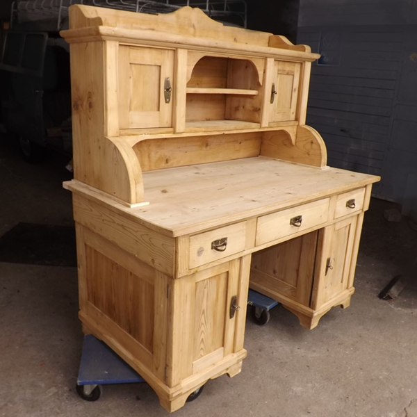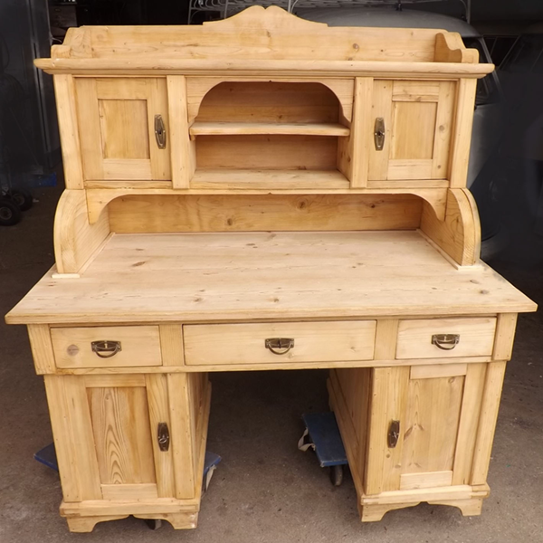 zerlegbar Weichholz entlackt (Aufsatzschreibtisch antik). Dreischübiger, von den Unterschränken abnehmbarer Zargenkasten; gefelderte Seiten. Aufsatz mit zentralem, horizontal unterteiltem Freifach, zwei Türen; darüber breite Ablage (siehe Detailbilder). Ökologisch nachhaltiges Massivholzmöbel um 1900.
