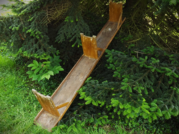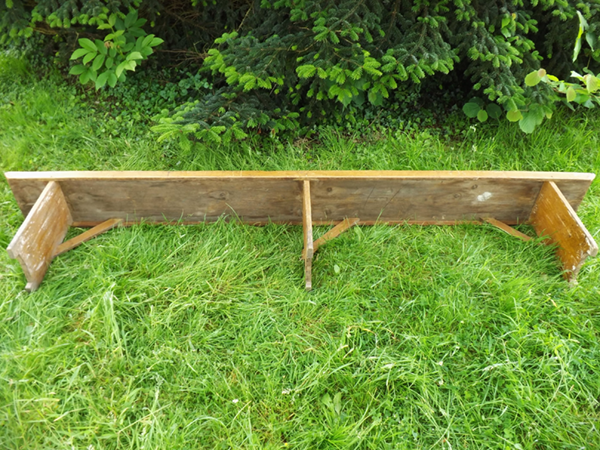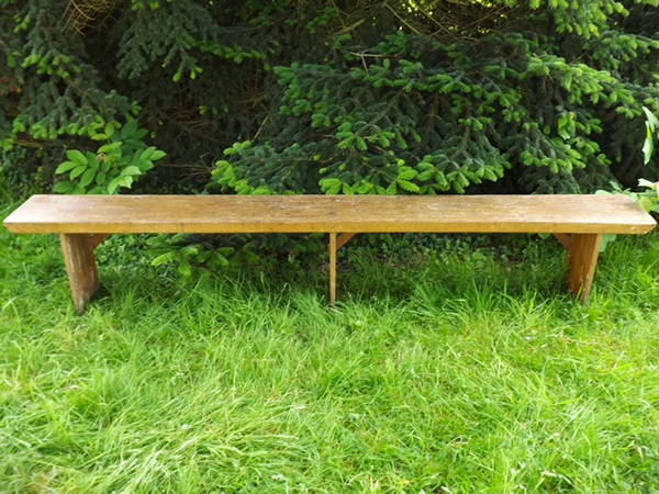 um 1920. Weichholz, hell bierlasiert. (Eifeler Bauernbank). Durchgehende Holzplatte auf eingezapften, quer verstärkten Brettfüßen, seitlich verblendet (siehe Detailbild). Alterskonform gut erhaltener Patinazustand.
